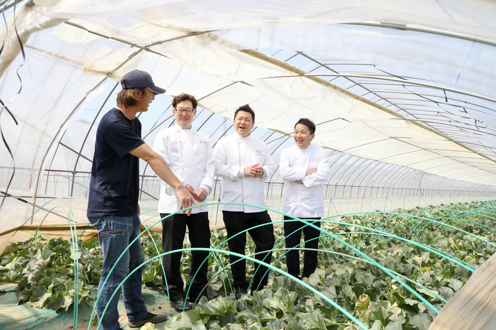 イバラキングをつかったスイーツバイキングの開催が3回目を迎えるにあたり、今回初めて総料理長柏木をはじめ3名のシェフが茨城県のメロンとこだますいかの生産地を訪れました。