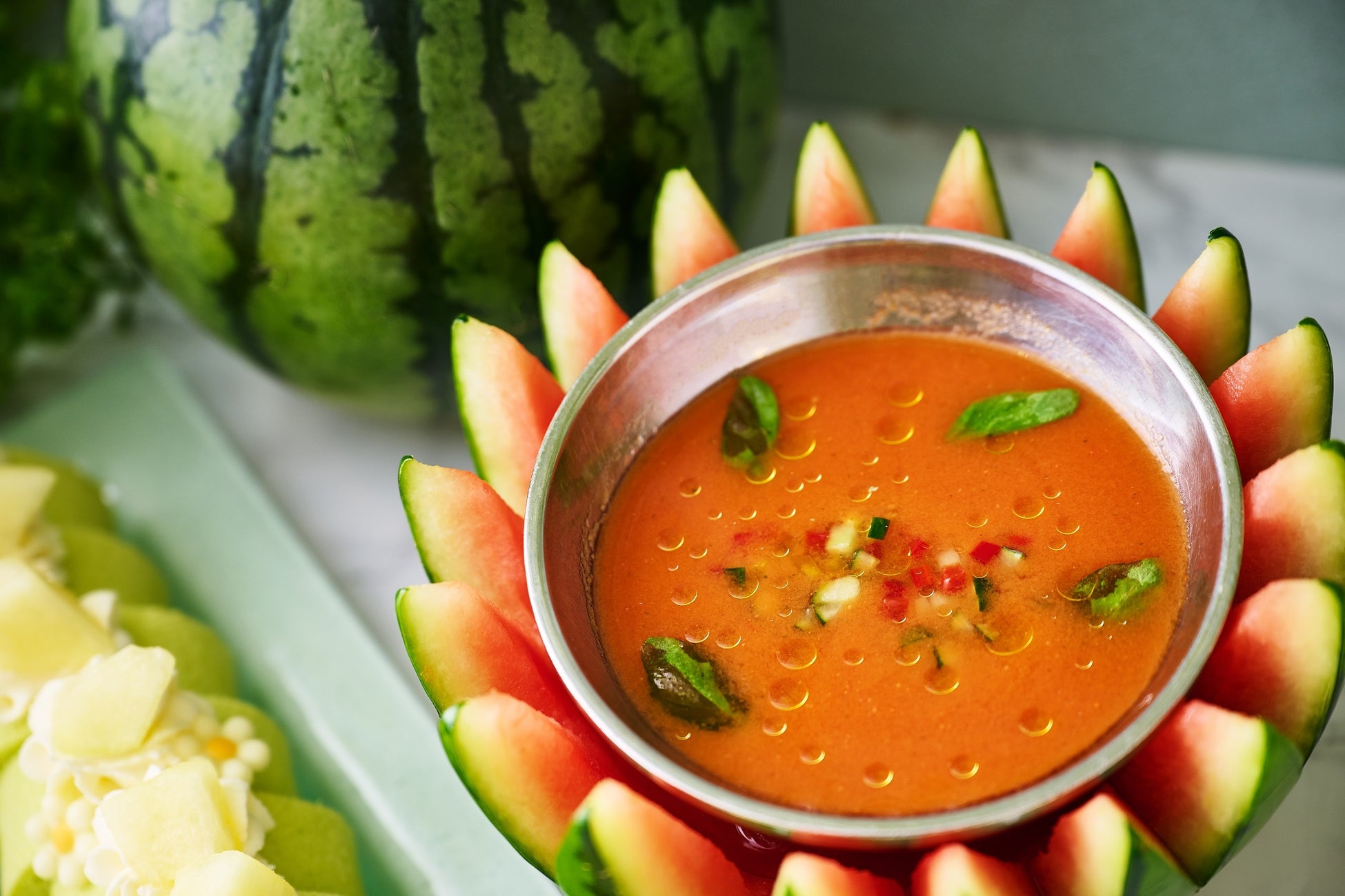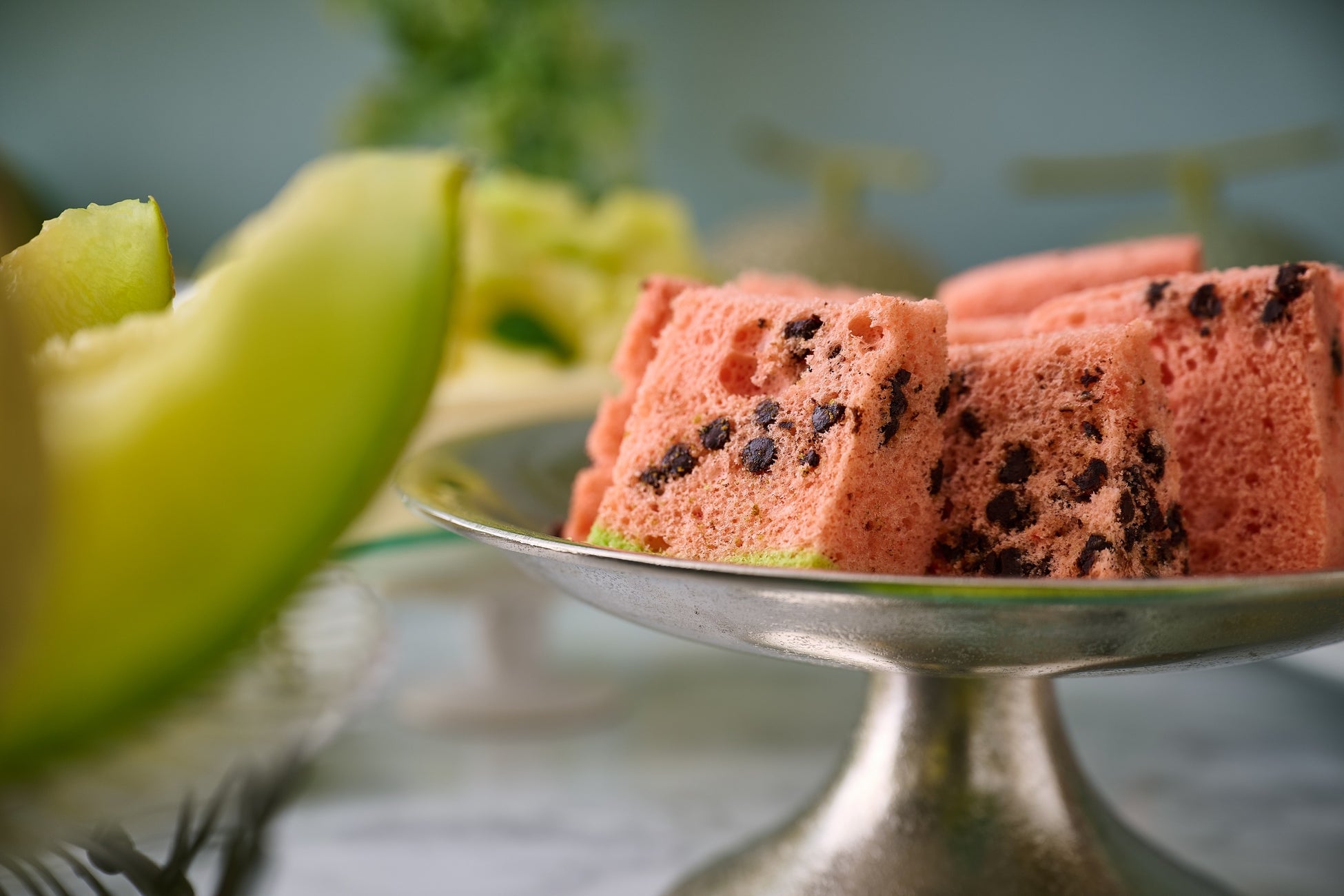 他にもメロンをつかったロールケーキやメロンタルト、茨城県産こだますいかをつかったジュレが登場。メロンパンのような見た目もかわいいクッキーや、カットしたすいかに見立てたシフォンなど、見て食べて楽しめるスイーツが並びます。軽食にも茨城県産豚肉 常陸(ひたち)の輝きのグリル、すいかの香りと甘みを感じていただけるこだますいかのガスパチョなど、茨城県産の食材をつかったメニューをご用意しました。
