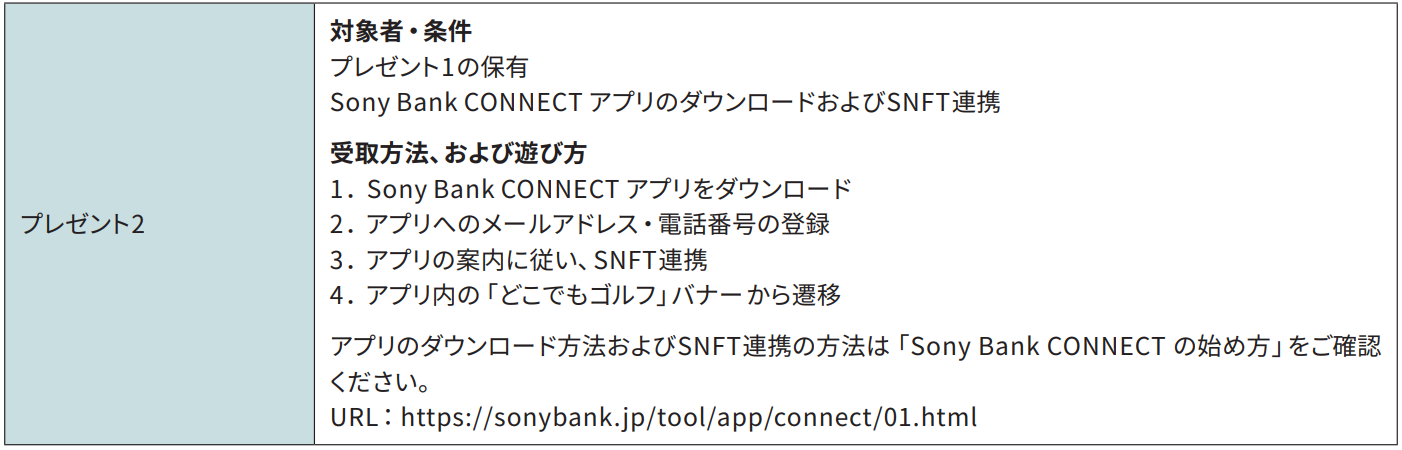 対象者・条件 プレゼント1の保有 Sony Bank CONNECT アプリのダウンロードおよびSNFT連携 受取方法、および遊び方 1.Sony Bank CONNECT アプリをダウンロード 2.アプリへのメールアドレス・電話番号の登録 3.アプリの案内に従い、SNFT連携 4.アプリ内の「どこでもゴルフ」バナーから遷移 アプリのダウンロード方法およびSNFT連携の方法は「Sony Bank CONNECT の始め方」をご確認ください。 |