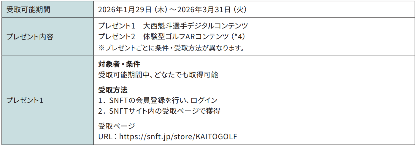 プレゼント1 大西魁斗選手デジタルコンテンツ プレゼント2 体験型ゴルフARコンテンツ(*4) ※プレゼントごとに条件・受取方法が異なります。 |
