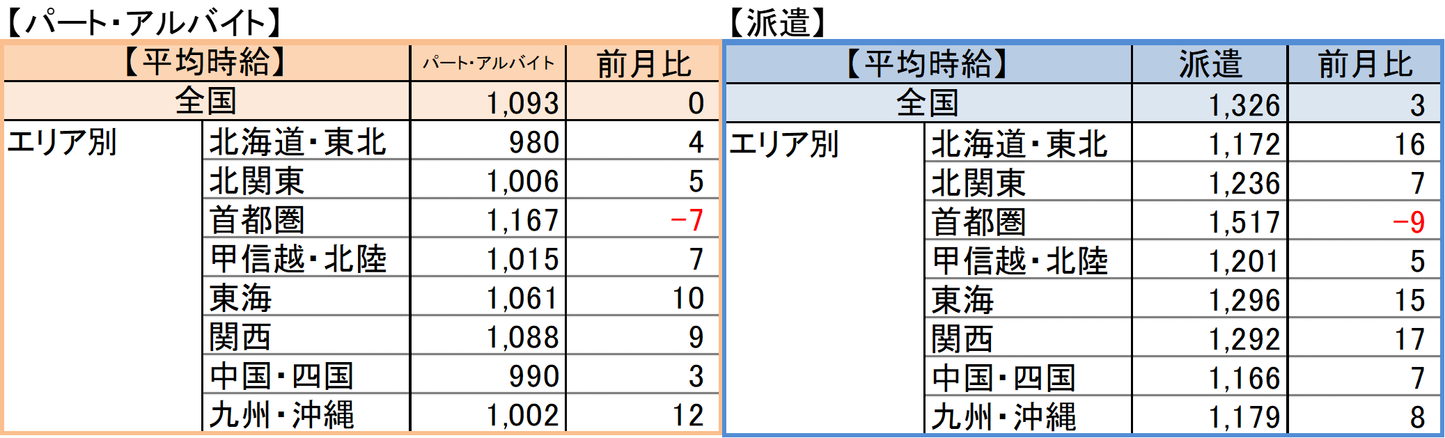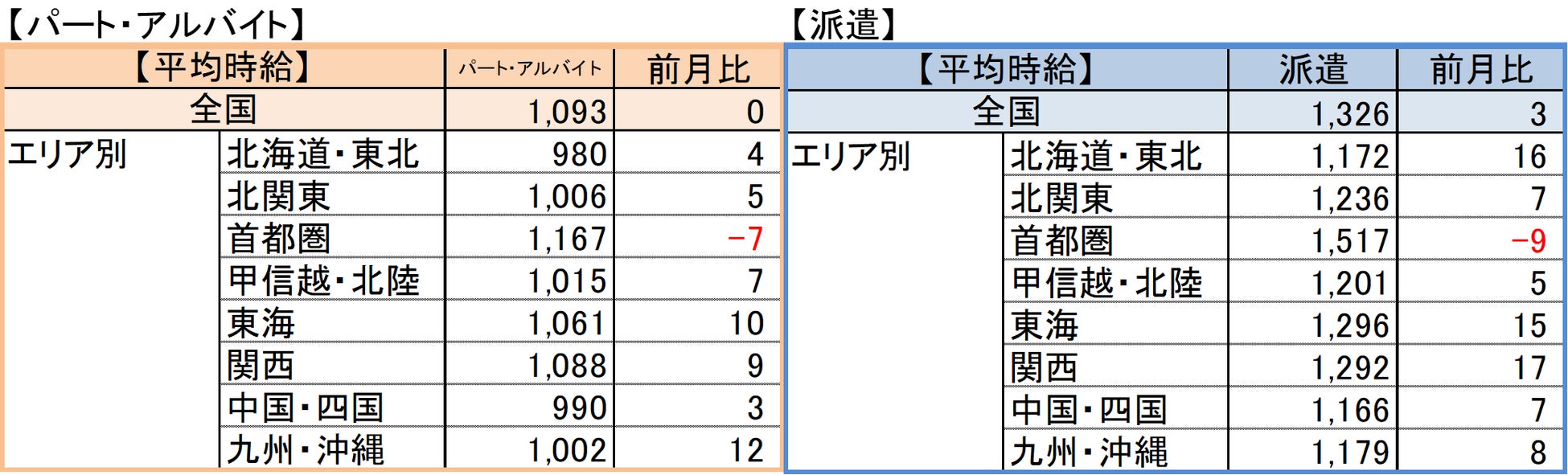 【パート・アルバイト】全国・全職種平均時給は1,093円。前月比±0円。前年同月比+8円。 【派遣】全国・全職種平均時給は1,326円。前月比+3円。前年同月比+10円。 【傾向】パート・アルバイトの平均時給が、半年程前に比べ低い水準で横ばいが続いているのは、全職種平均よりも時給相場が低い「フード・飲食」カテゴリの求人比率が高い状態が続いているため。新型コロナウイルスの5類移行に向けて4月に飲食店の求人が急増した後も、求人数が多い状態が続いている。今後、最低賃金の改定に向けて、平均時給は上昇する見込み。派遣の平均時給は横ばい。 |