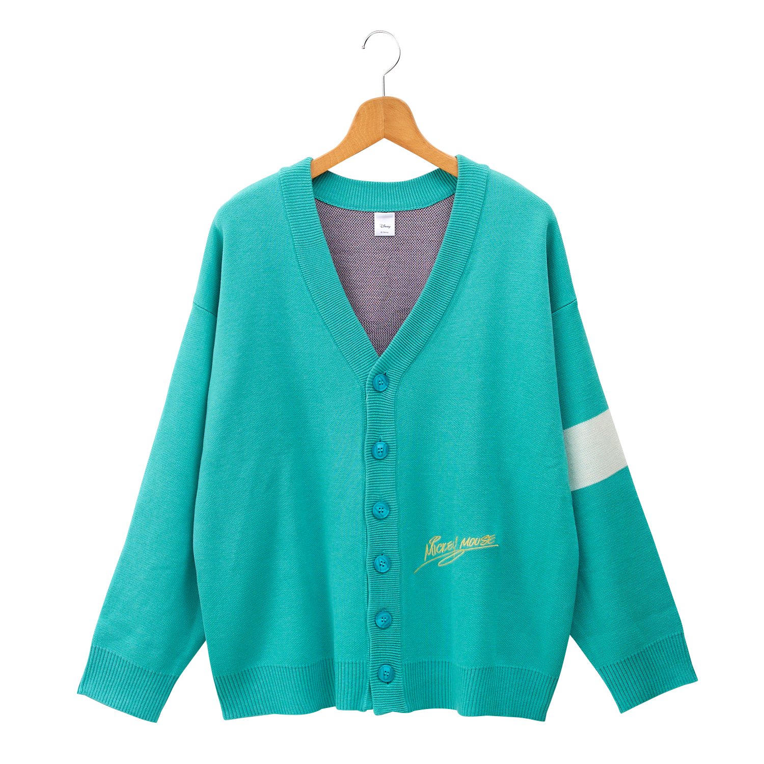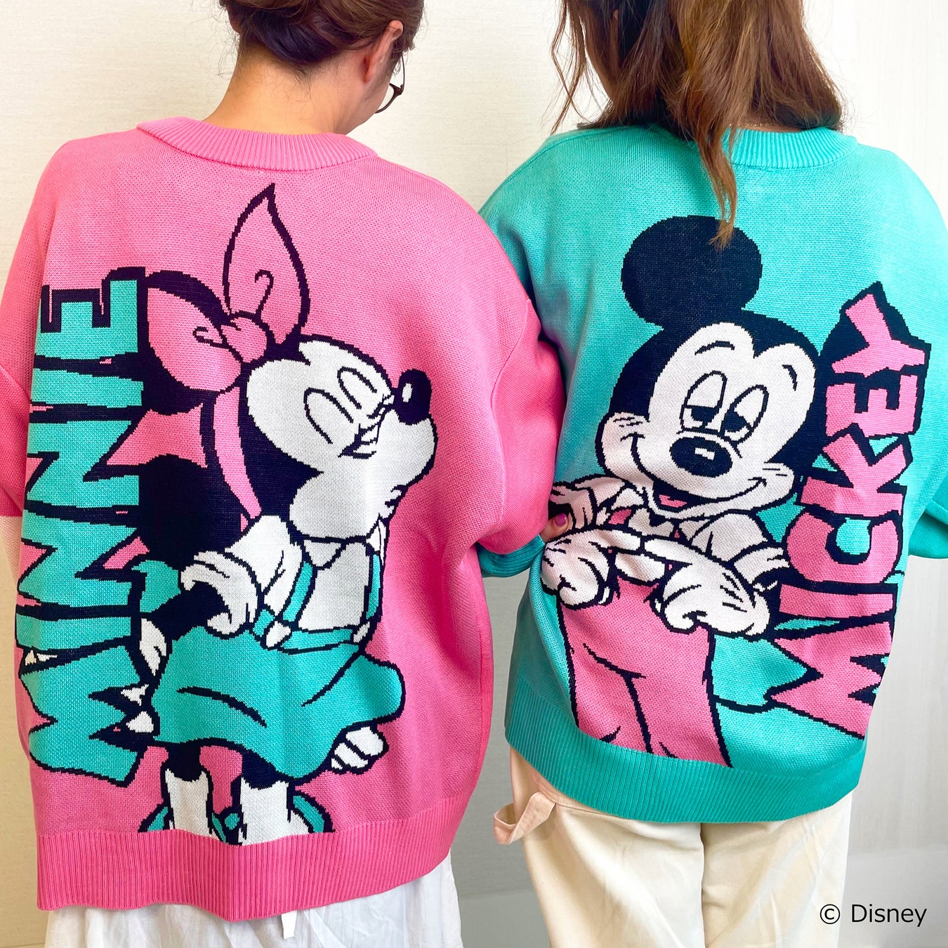 80~90’sのUSEDウエアを思わせる、レトロテイストなカラーリング&大胆な背面デザインが目を惹くカーディガンは、ミッキーマウス(ブルー)とミニーマウス(ピンク)の全2種!ペアで着用して横にならぶと、背面のミッキーマウス&ミニーマウスのイラストアートがリンクするのも見逃せないポイントです。