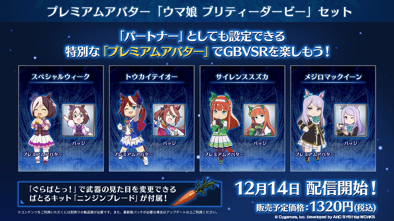 「ウマ娘 プリティーダービー」でおなじみのキャラクター「スペシャルウィーク」「トウカイテイオー」「サイレンススズカ」「メジロマックイーン」のプレミアムアバターセットが有料ダウンロードコンテンツとして12月14日(木)より配信予定です。本コンテンツは、ロビーアバターとして使用できるほか、ウマ娘たちが「パートナー」としてプレイヤーを応援してくれます。ほかにも、プロフィールに設定できるバッジや「ぐらぶるレジェンドばとるっ!(ぐらばとっ!)」で武器の見た目を変更できる“ばとるキット「ニンジンブレード」”も同梱します。