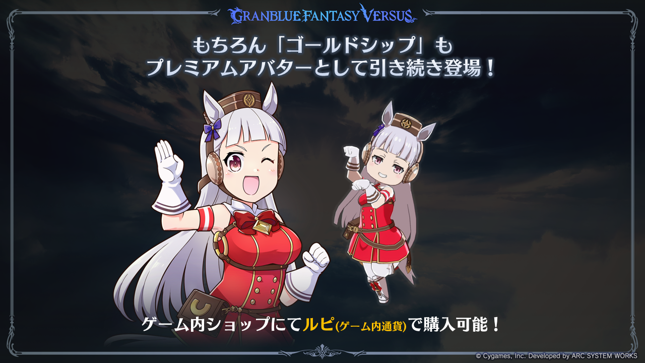 また、前作『グランブルーファンタジー ヴァーサス』でも登場していた「ゴールドシップ」もプレミアムアバターとして引き続き登場。「ゴールドシップ」はゲーム内ショップにてルピ(ゲーム内硬貨)で解放できます。