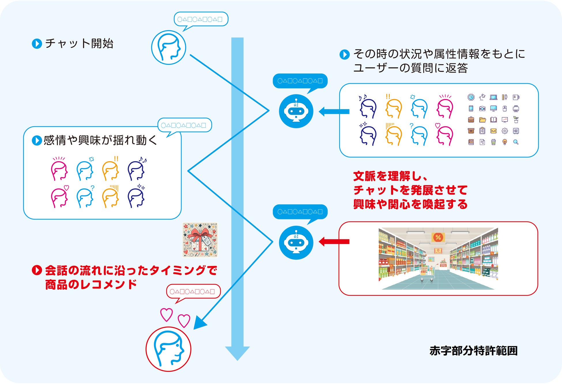 本技術は、AIとユーザーの会話を通じて好みや実は興味をもっていることなどを見いだし、そのニーズに合わせた商品やサービスのレコメンドを、最適なタイミングで会話に自然に組み込むことを可能にします。その際、ユーザー本人の同意取得の範囲において、購入履歴や過去の会話、また会員情報といった属性情報も活用し、精度を高めます。