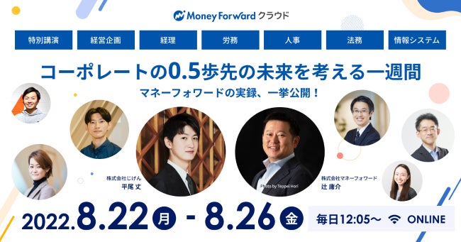 「コーポレートの0.5歩先の未来を考える一週間」は、マネーフォワードの経営企画・経理・人事・労務・法務・CIO室など各コーポレート部門の責任者や担当者の具体的な取り組みやノウハウをお伝えすることを目的としたオンラインイベントです。8月22日〜26日の5日間にわたって、企業が急成長するために必要な意思決定と、それを支えるコーポレート部門において起こりえる課題と解決策をお伝えします。
