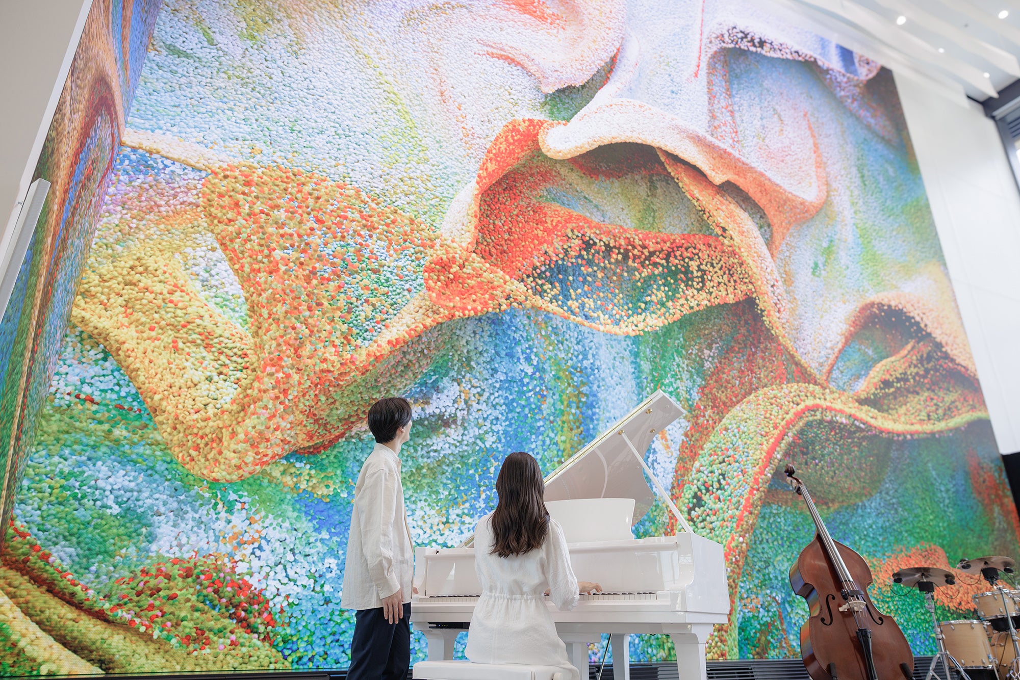 エクスペリエンスゾーンとなる「Music Canvas」は映像と立体音響、そして楽器による音楽への没入体験を全身で感じられるイマーシブなエリアです。開放感あふれる吹き抜けの空間には、壁一面に設置された大型LEDディスプレイと連動したAI伴奏付きのピアノ演奏体験や、自動演奏する弦楽器の振動に触れる体験など、五感で楽しめる豊富なコンテンツを用意し、来場者は自由に体験することが可能です。
