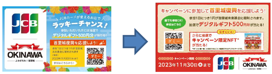 CP内容 | ① 期間中、店頭に貼っているキャンペーンステッカーのQR コードを読み取り、専用サイトにアクセス ② アンケートに回答しキャンペーンに参加すると、参加1 回につき1 円を首里城未来基金へ寄附 ③ 抽選でデジタルギフト500 円分をその場でプレゼント <以下、リニューアルにより9月29日より追加実施(W チャンスキャンペーン)> ④ 抽選で本キャンペーン限定デザインのNFT をその場でプレゼント ※③の当落に関わらずW チャンスキャンペーンに参加可能 ※キャンペーン参加は1 日につき1 回まで |