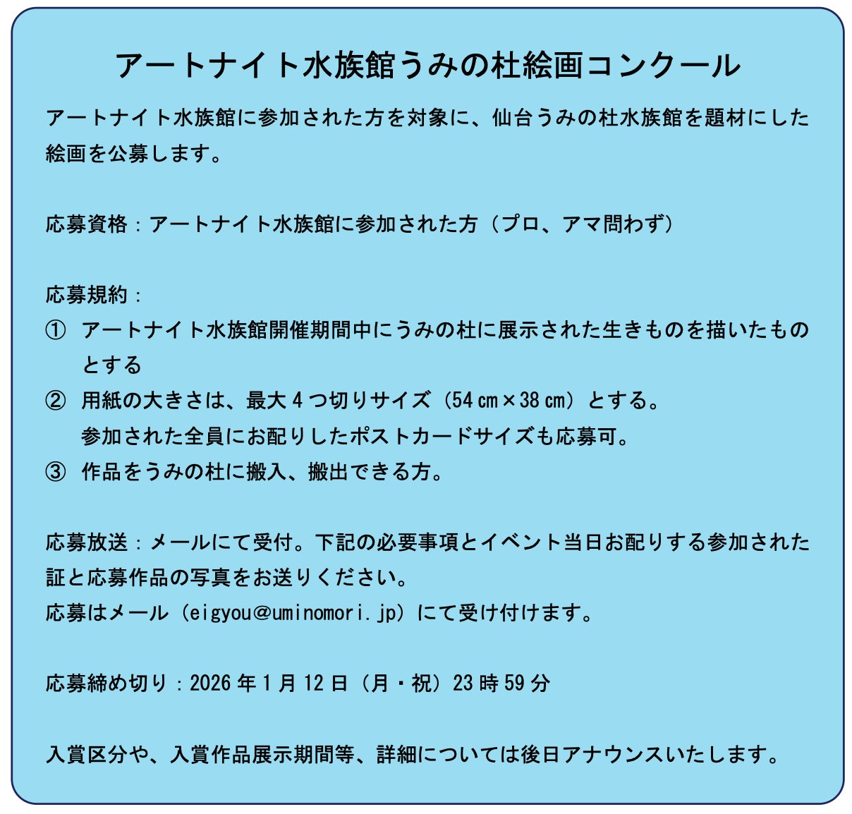 海と人、水と人との、新しい「つながり」をうみだす水族館『仙台うみの杜水族館』では、2025年12月13日(土)の閉館後、普段の営業中は制作することが出来ない空間で、心置きなく絵を描くことができ、表現活動を通して生きものの魅力にふれることができる「アートナイト水族館」を初開催します。実際に目の前で生きものを観察しながら描くことができるイベントで、創作活動に興味がある方から携わっている方まで、どなたでもお気軽にご参加いただけるイベントです。当館が展示する約300種5万点の生きものたちと向き合いながら、夜の水族館で集中して制作をお楽しみいただけます。