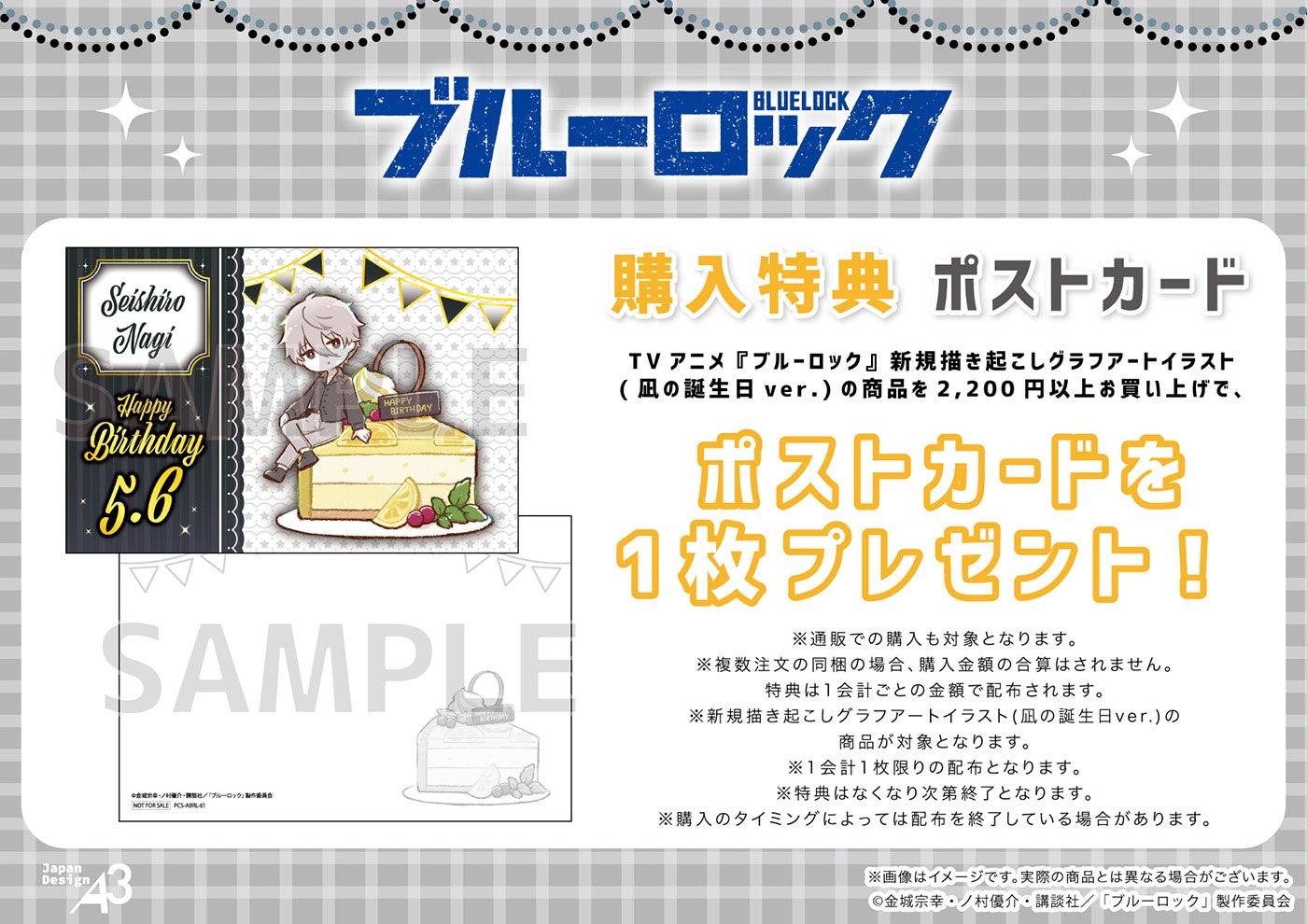TVアニメ『ブルーロック』の新規描き起こしグラフアートイラスト(凪の誕生日ver.)の商品を2,200円(税込)以上お買い上げで、ポストカード(全1種)をプレゼント!