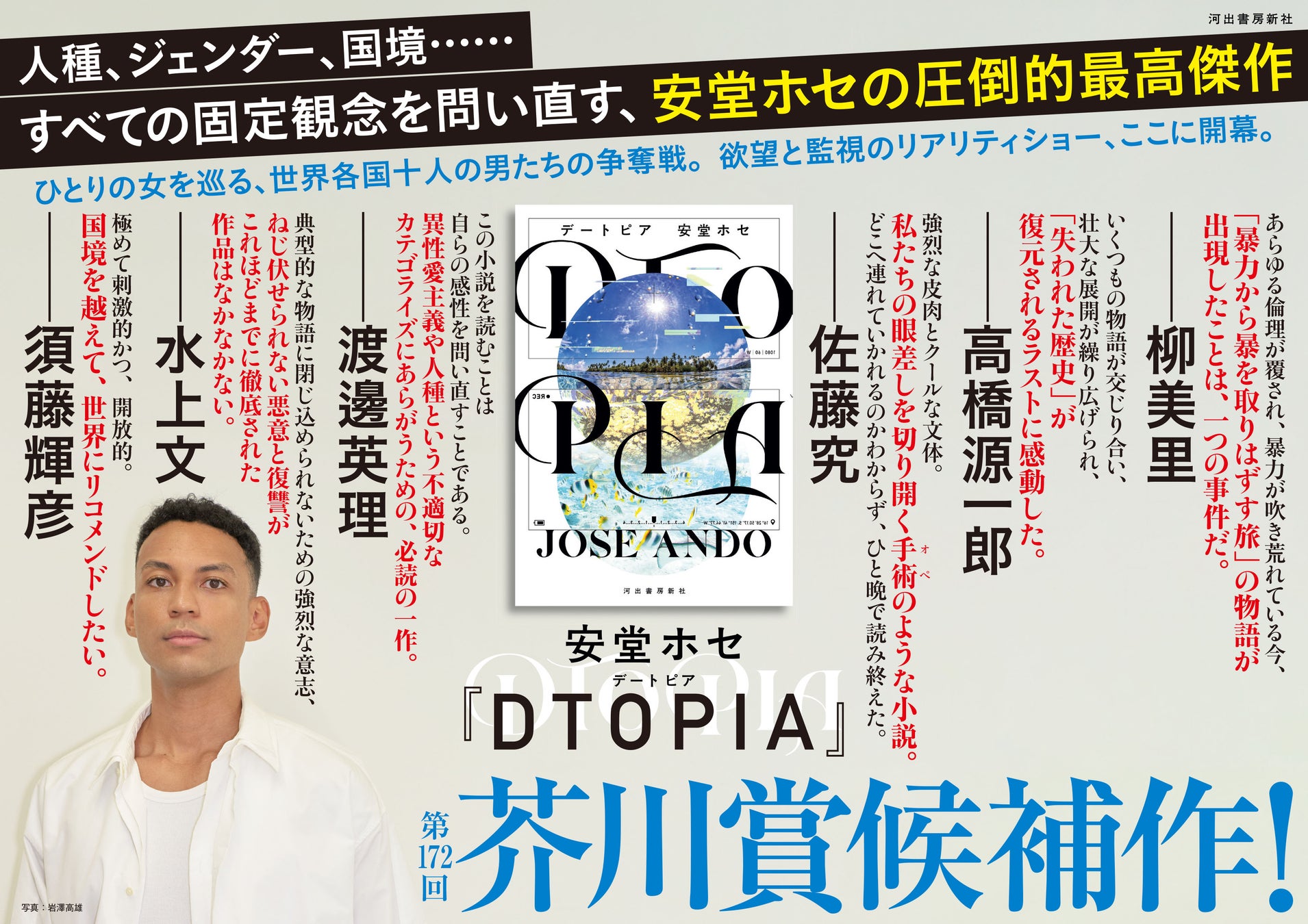 「文藝」2024年秋季号に掲載、11月1日に単行本として刊行された、安堂ホセ著『DTOPIA(デートピア)』が、第172回芥川龍之介賞の候補作に選出されました。