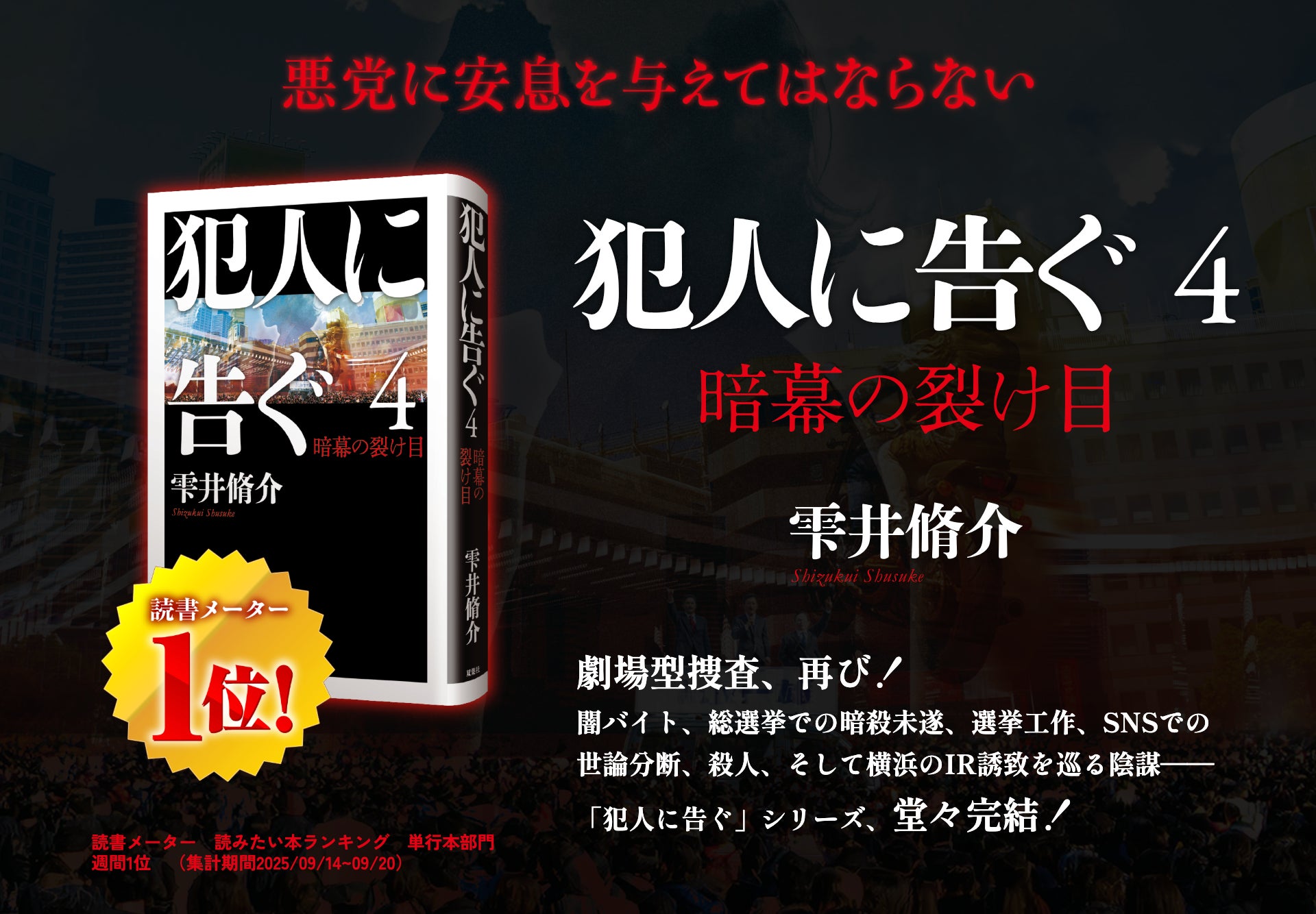 シリーズ第1作目は、豊川悦司氏主演で映画化され話題を呼び、第7回大藪春彦賞受賞、「週刊文春ミステリーベストテン」第1位、第2回本屋大賞にもノミネートされました。完結編となる最新刊『犯人に告ぐ4 暗幕の裂け目』は、読書メーター読みたい本ランキング単行本部門週間1位(20205/9/15~9/21)を獲得。