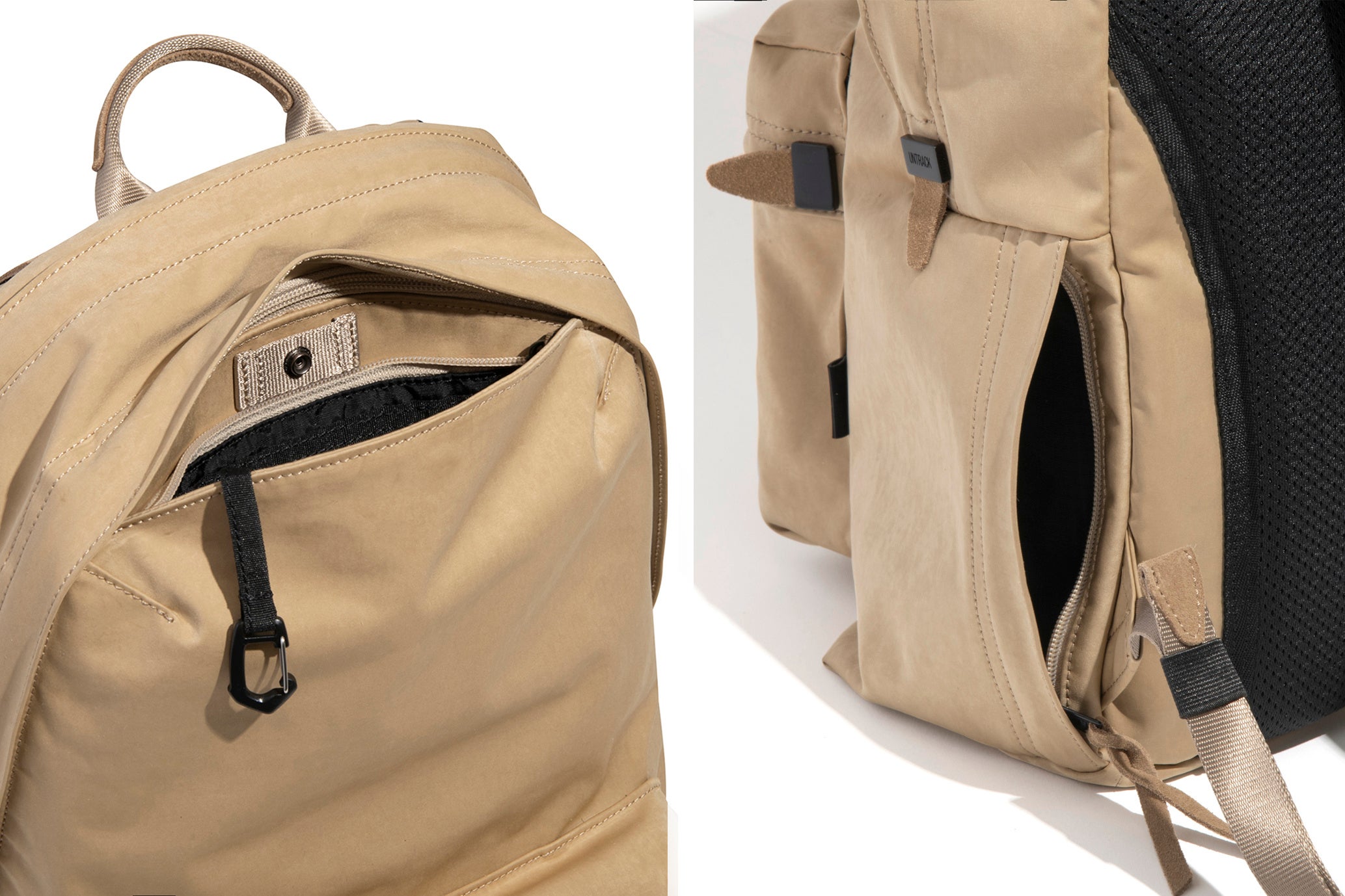 フロント上部には外から見えにくいトップポケット、両サイドにはスマホやパスケースの出し入れに適したオープンポケットとファスナーポケットを配置。