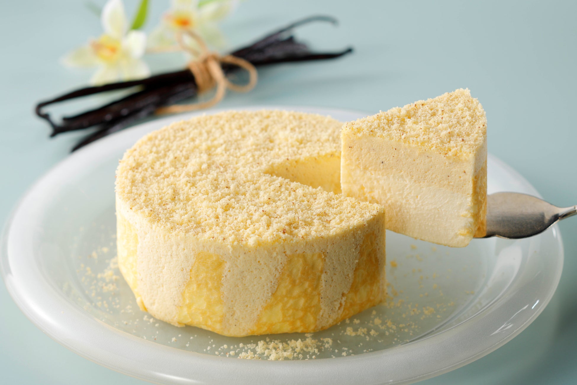 タヒチ産バニラのペーストと北海道製造のクリームチーズとマスカルポーネで仕立てた”バニラフロマージュ”と、北海道製造の生クリームとクリームチーズで仕立てた”ムースフロマージュ”をクレープ生地でやさしく包み、プレーンとココアのクラムで華やかに彩った2層仕立てのケーキです。