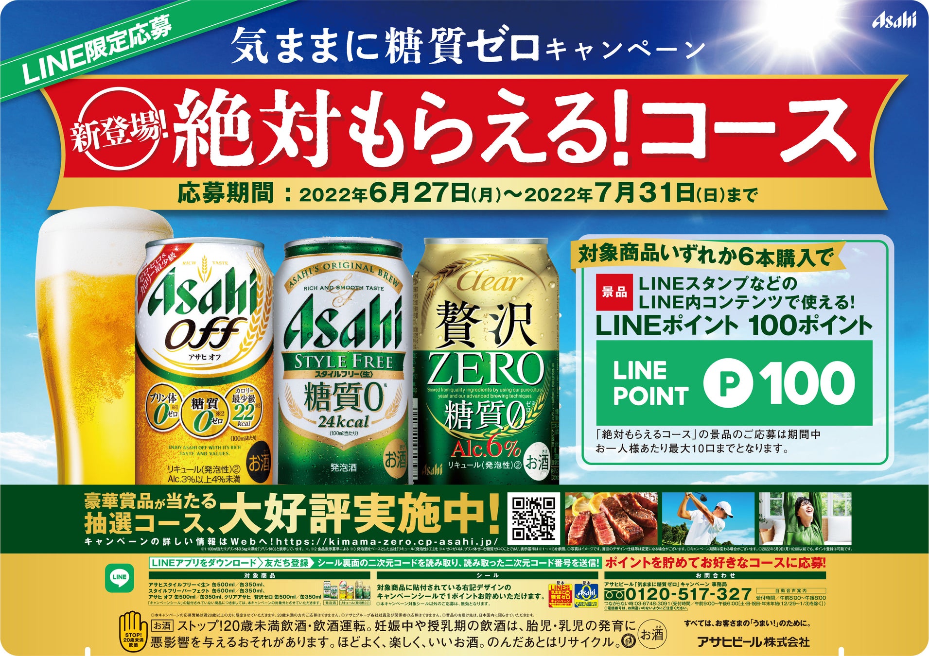 アサヒビールは、糖質やプリン体などに配慮したビール類として『アサヒ オフ』や『クリアアサヒ 贅沢ゼロ』に加え『アサヒスタイルフリー<生>』『スタイルフリー パーフェクト』などを展開しています。上記4ブランドを対象に、さまざまな賞品が抽選で当たる「気ままに糖質ゼロキャンペーン」を5月9日から12月末まで実施します。6月27日から7月31日には“LINEポイント100ポイント”が絶対もらえるコースを展開することで、購入喚起を図ります。