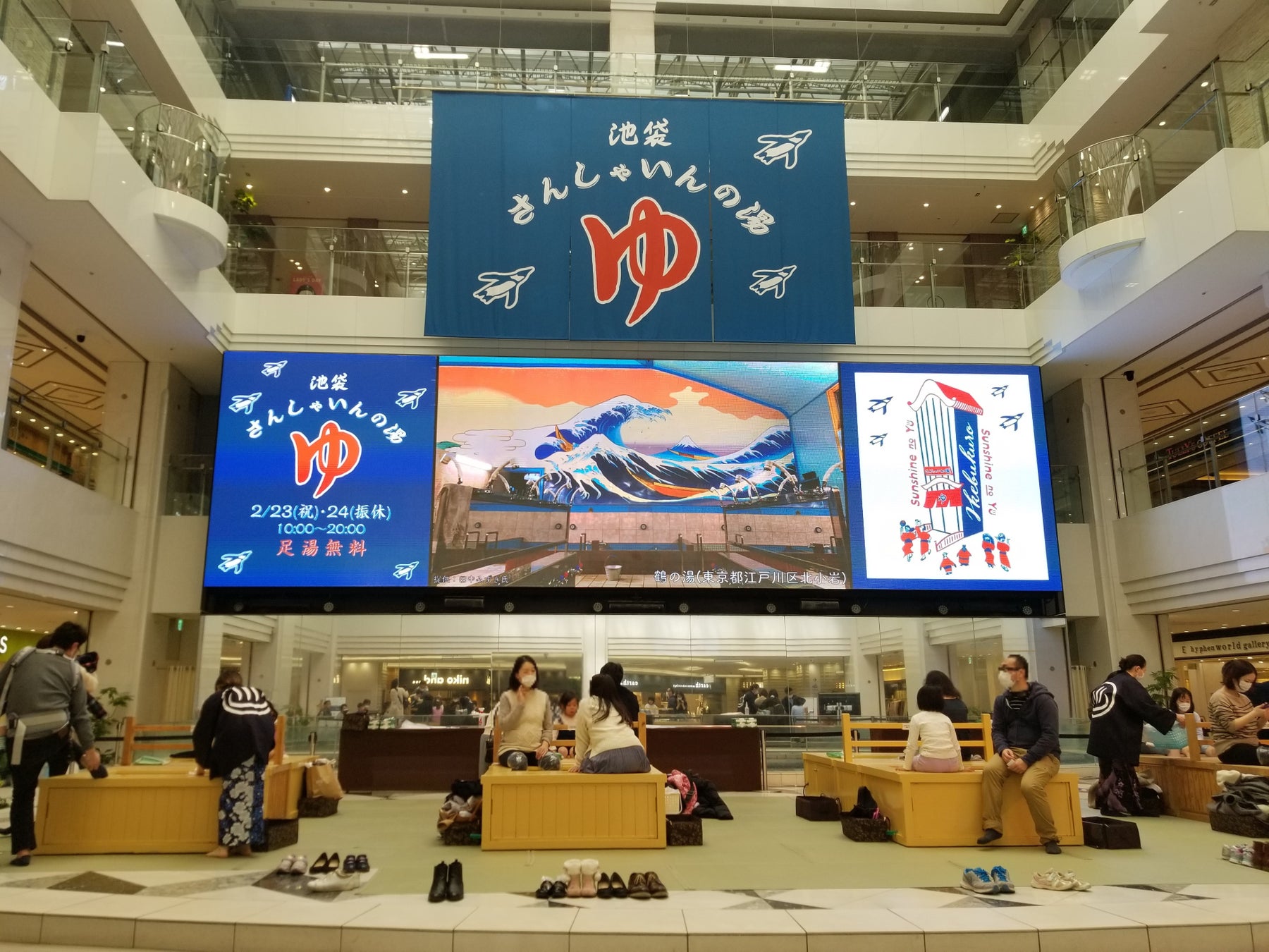 四層吹き抜けの噴水広場を生かして銭湯をイメージした巨大な暖簾を吊り、都内の銭湯に描かれている富士山などのペンキ絵の写真を628インチの巨大ビジョンに映し、畳シートを敷いたステージの上に足湯が登場します。
