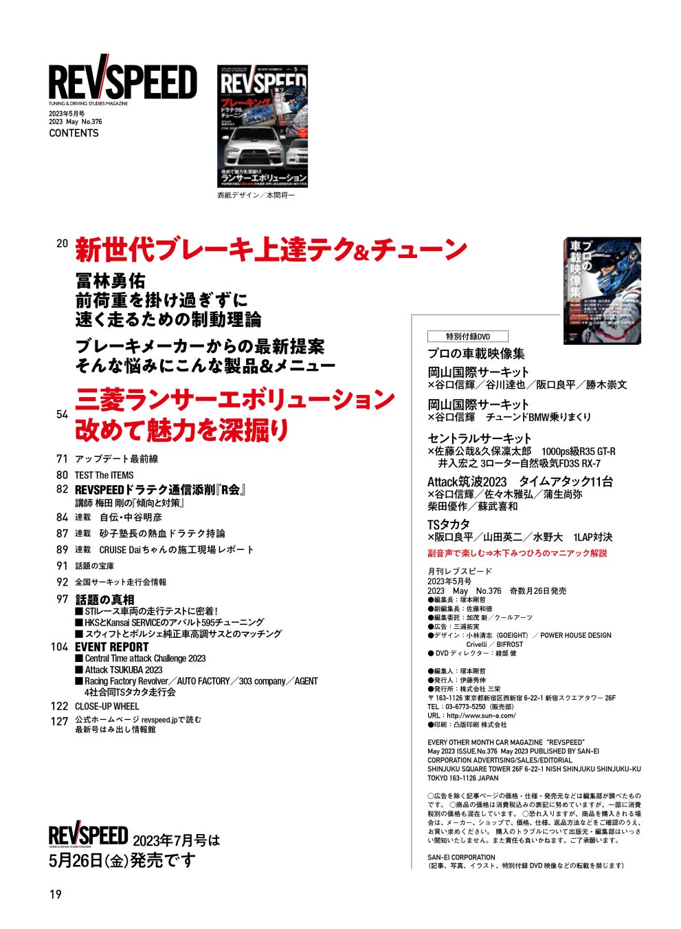 レブスピード2023年5月号発売!誌面特集は『ブレーキドラテク&チューニング』。付録DVDはプロのタイムアタック・オンボード映像満載!