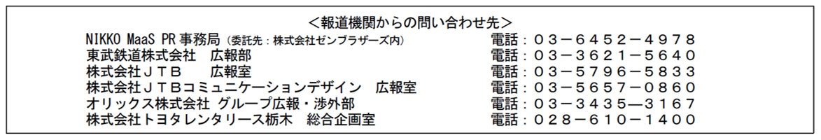 東武鉄道(本社:東京都墨田区、取締役社長:根津 嘉澄)、JTB(本社:東京都品川区、代表取締役 社長執行役員:山北 栄二郎)、栃木県(知事:福田 富一)、JTBコミュニケーションデザイン(本社:東京都港区、代表取締役 社長執行役員:古野 浩樹)、オリックス自動車(本社:東京都港区、代表取締役:上谷内 祐二)及びトヨタレンタリース栃木(本社:栃木県宇都宮市、代表取締役社長:新井 将能)で昨年10月よりサービスを開始している国内初の環境配慮型・観光MaaS「NIKKO MaaS」が3月16日(水)よりサービス内容を拡充、「NIKKO MaaS WEBサイト」よりワンストップで観光チケットを購入・利用いただけるようになります。