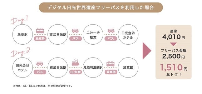 スマートフォン一つで、WEB上でご利用いただけるお得なフリーパスの手配が可能です。フリーパスを購入いただくことで、鉄道やバスが従来の旅行より最大3~4割もお得にご利用できるほか、拝観・入場料などの割引、さらには特典協賛店舗も約50店舗と、今まで以上にお得に日光・鬼怒川エリアの観光旅行をお楽しみいただけます。