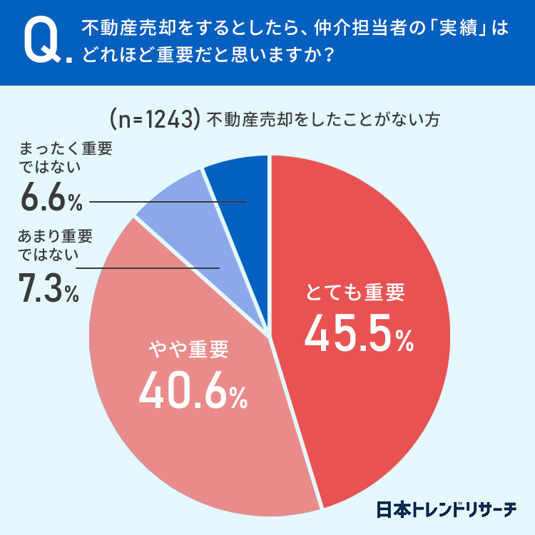 また、今度は不動産売却をしたことが「ない」方を対象に、不動産売却をするとしたら、仲介担当者の「実績」はどれほど重要だと思うか当てはまるものを選んでもらいました。