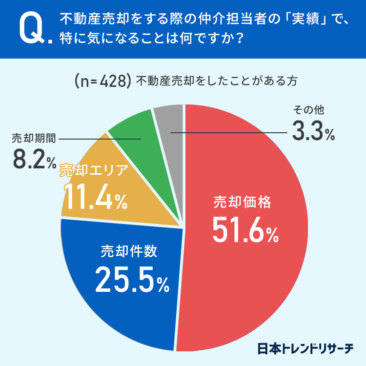不動産売却の経験者のうち51.6%が、仲介担当者の実績で特に気になるのは「売却価格」と回答しています。