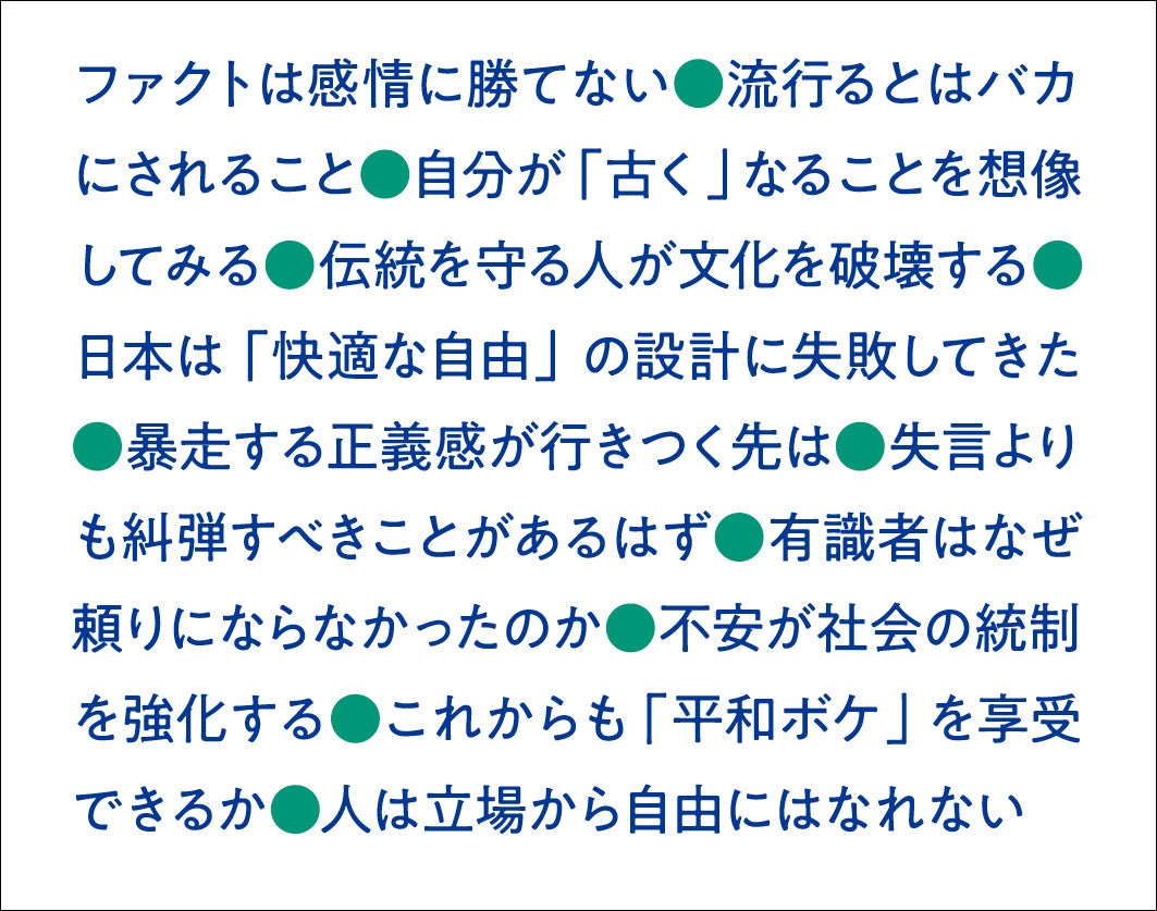 正しすぎる社会は息苦しい――。失言をくり返す政治家も、ポリコレを掲げて暴走する人も、自分は常識的だと思っている人たちも、誰もが自分の色眼鏡で世界を見ているものだ。それらがすれ違い、時にぶつかり合うのは当然だけども、他人の考え自体を受け入れられず、現実社会の歪みを許容できない「正義の味方」は何だか怖い。自分にも他人にも自由を認め、ままならない世界を柔軟に生きるための思考法。