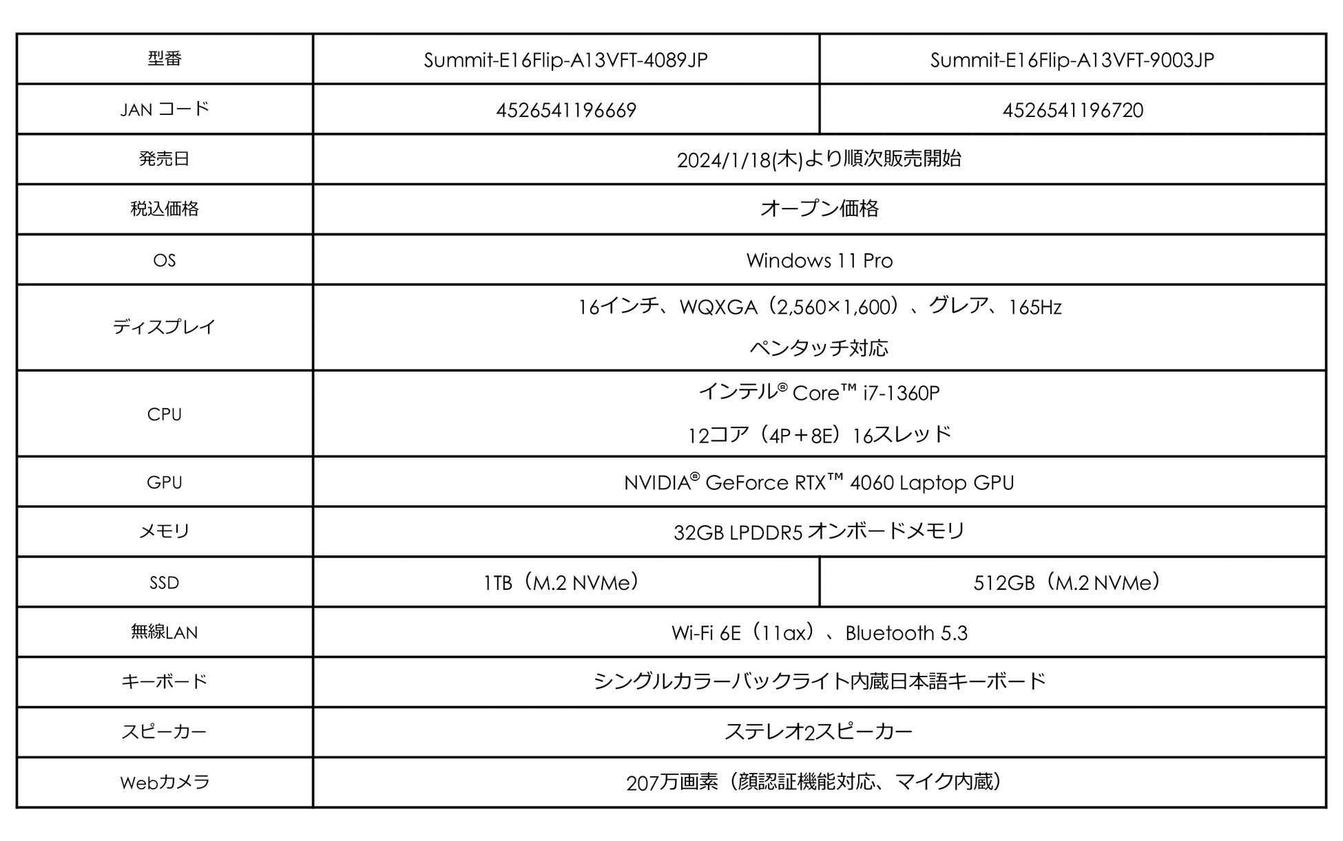 360度フリップディスプレイとRTX 4060を組み合わせたビジネス・クリエイターノートPC「Summit E16 Flip A13V」シリーズのバリエーションモデル発売
