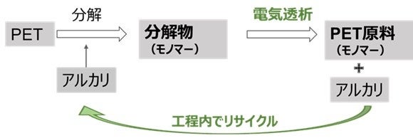 さらに早稲田大学との共同研究で、「電気透析法」を活用したモノマーの精製法を開発しました。この技術を採用することで、従来必要としていた化学薬品を大幅に削減でき、発生していた副産物の廃棄も不要になります。さらに「電気透析法」を使用することで精製工程中にアルカリ成分を再生でき、これを分解工程で再利用できるため、資源循環型のリサイクルプロセスも実現できます。