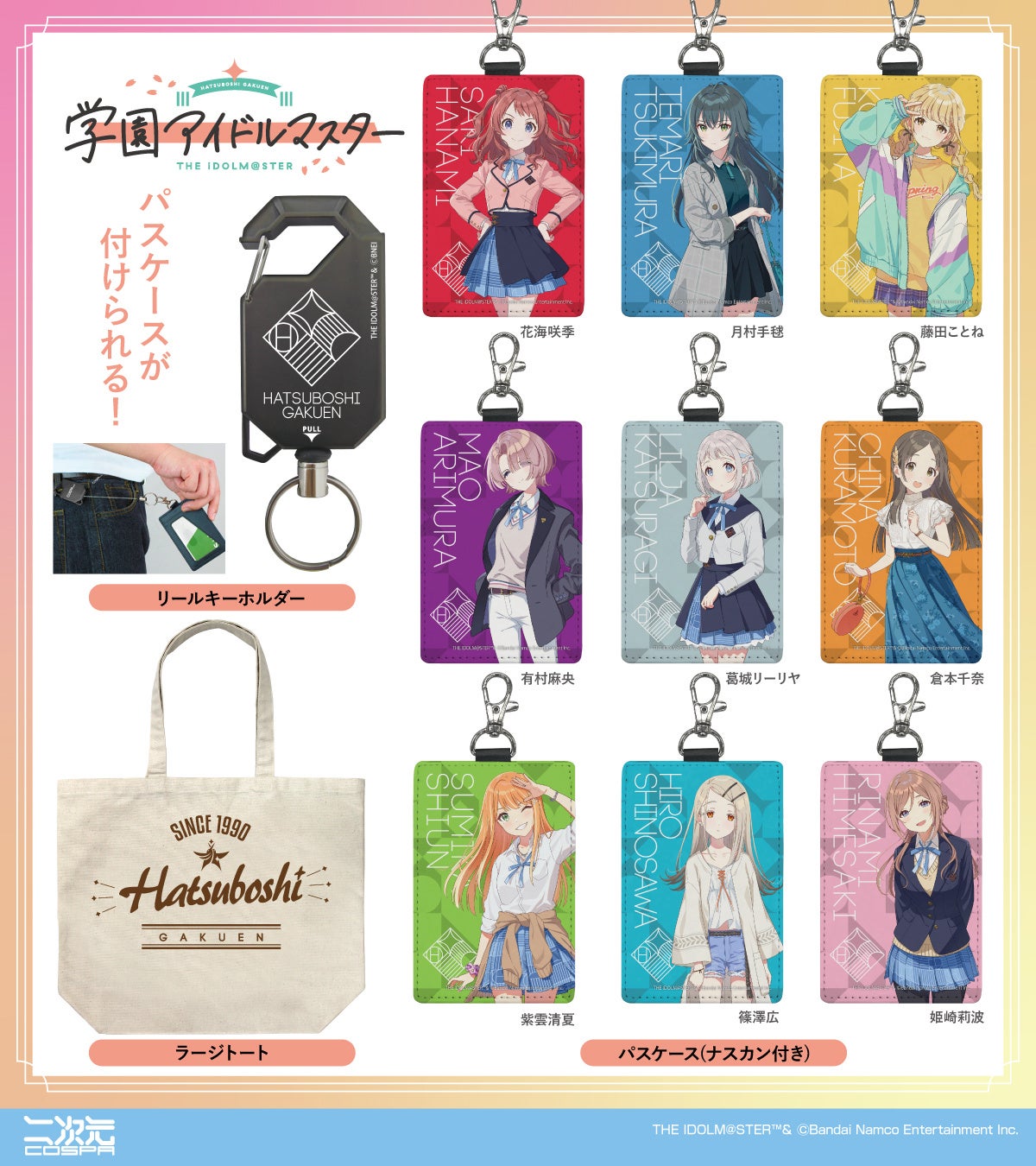 『学園アイドルマスター』「花海咲季」たち9人それぞれのオールプリントTシャツやパスケース、「初星学園」リールキーホルダーなどプロデューサー必携の新商品が登場!【株式会社コスパ】