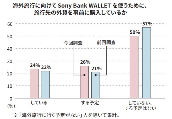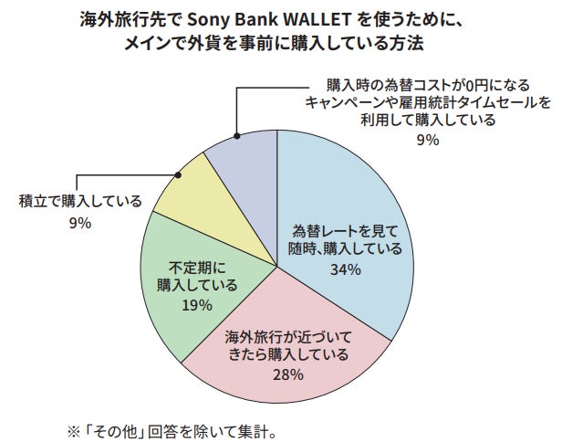 海外旅行のために普段より預金を多くしているかたは、前年より3ポイント増え24%。外貨を事前に購入しているかたのうち、海外旅行先で Sony Bank WALLET を使うために外貨を購入するタイミングは、「為替レートを見て随時購入」が最も多く34%。