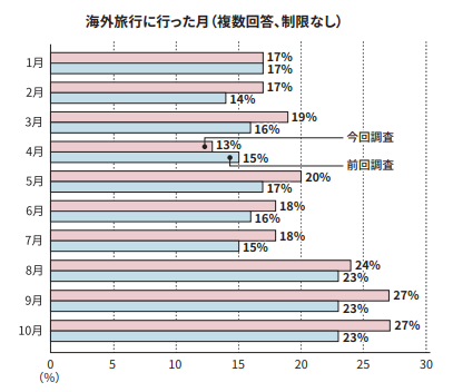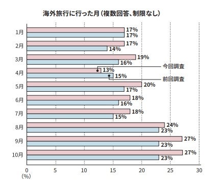 海外旅行に行ったかたは前年より5ポイント増え43%に。海外旅行をした時期は、9月と10月が最も多くいずれも27%となり、お盆の時期を外した夏休み旅行が多くなった。