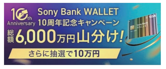 みなさまのご愛顧に感謝して、総額6,000万円を山分け、抽選で100名さまに10万円をプレゼントする「Sony Bank WALLET 10周年記念キャンペーン」を実施中です。この機会にぜひご利用ください。