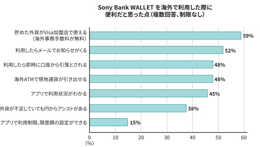 Sony Bank WALLET の海外利用において、「貯めた外貨が海外事務手数料無料でVisa加盟店で使える」という点が便利だったと回答したかたが59%を占め、前年と同様に最も多い結果となりました。また、海外でもタッチ決済を使える点も便利だったという回答も見られました。利用金額がメールでくることも、海外で安心して使うポイントとして支持をいただいています。