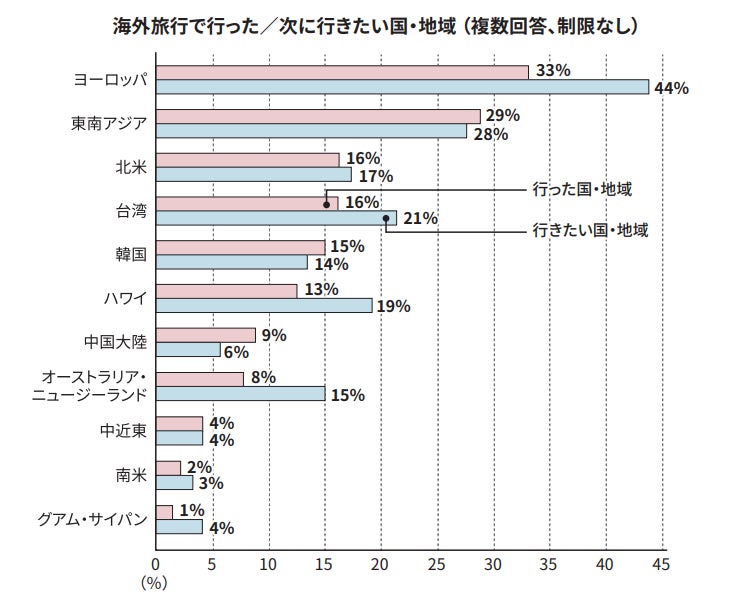 海外旅行に行った国・地域では、ヨーロッパが最も多く33%、次いで東南アジアが29%となりました。次に行きたい国・地域もヨーロッパが最も多く44%まで伸び、東南アジアは行ったかたの割合とほぼ同率の28%となりました。台湾やハワイ、オーストラリア・ニュージーランドは行ったと回答したかたより、次に行きたいと回答したかたが5ポイント以上多い結果となりました。