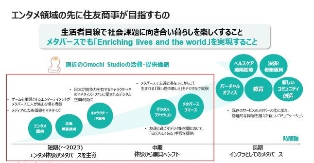 住友商事は、メタバースならではの体験が消費者の行動に変容を起こし、メタバース上で新しい消費行動や産業が起きると捉えています。「ペタペタサマ」のように消費者を惹きつけるコンテンツを通じて、より多くの消費者を集め、消費者に対してメタバースならではの購買体験や教育サービスなどの新しい体験を提供し、これまで取り組んできた食品流通・小売り事業などのリアルでの価値提供に加え、黎明期のメタバース・ROBLOX でも「Enriching lives and the world」を実現する新たな価値の創出を目指します。