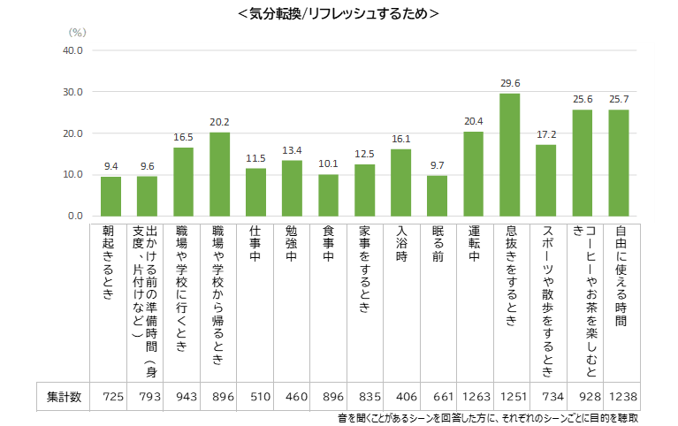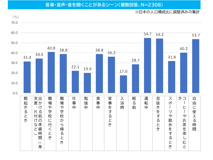- 音楽・音声・音を意識して聞くことがあるシーンとして「運転中」「息抜きをするとき」「自由に使える