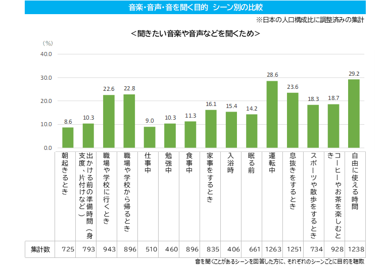 - 聞きたい音楽や音声などを聞く目的では「自由に使える時間」や「運転中」のシーンで聞かれている