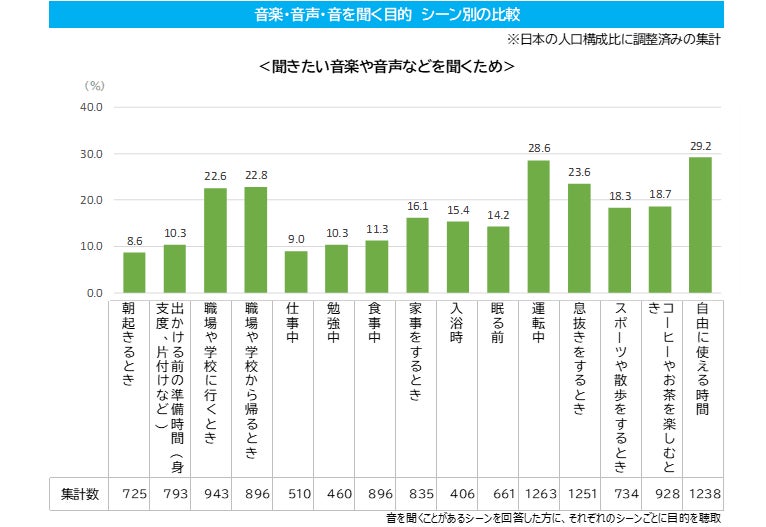シーンごとに「音」を聞く目的を比較してみると、「聞きたい音楽や音声などを聞くため」では「自由に使える時間」(29.2%)、「運転中」(28.6%)が高くなりました。「息抜きをするとき」「職場や学校から帰るとき」「職場や学校に行くとき」が続き、移動時間も聞きたい音楽・音声を聞く重要な時間帯となっています。