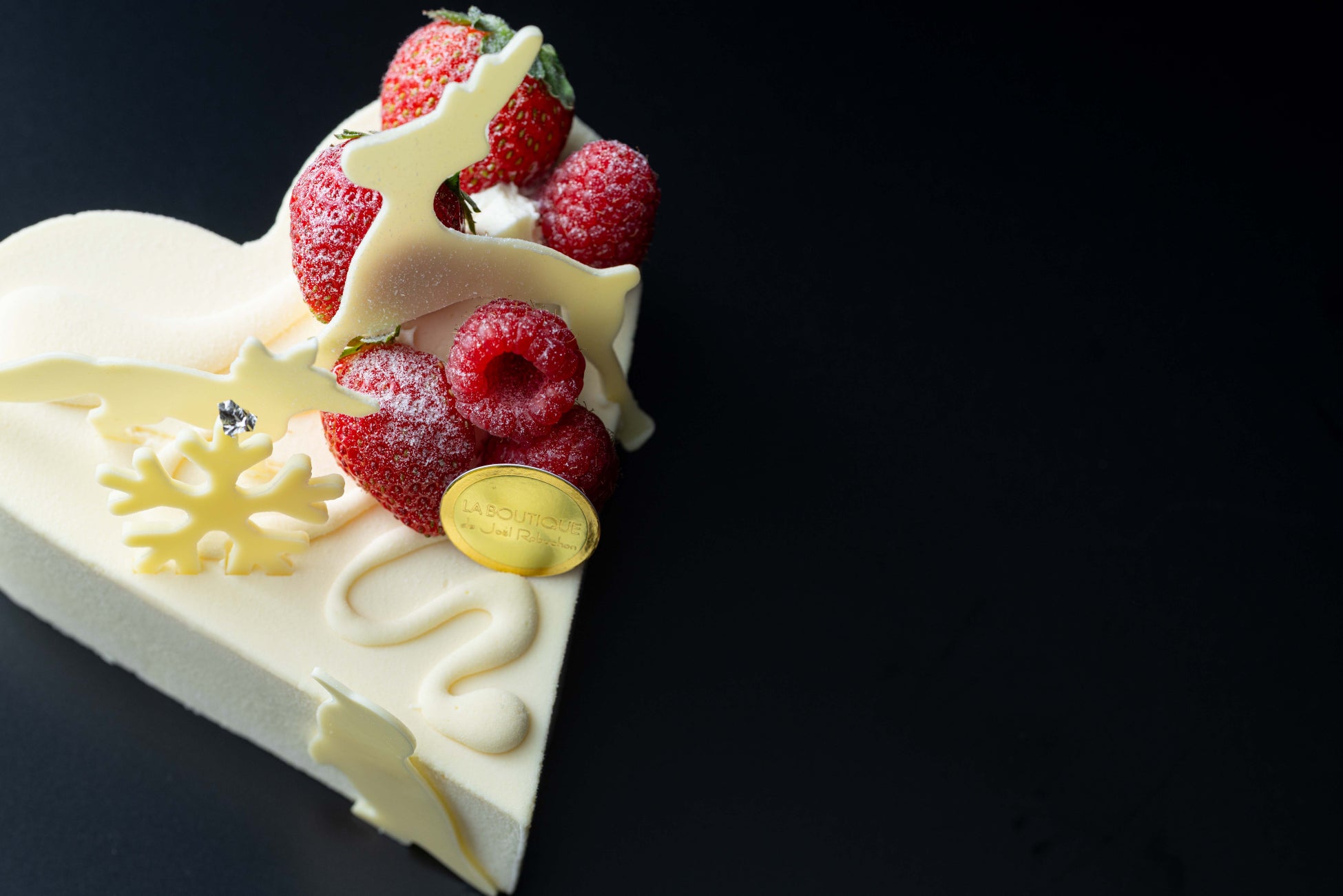 白銀の中、動物たちが集うハート形のかわいらしいクリスマスケーキです。トナカイやペンギン、キツネが雪の中で遊んでいる様をイメージしています。ミルキーな優しい甘さのホワイトチョコレートムースに甘酸っぱいラズベリーのジュレを閉じ込め、ヘーゼルナッツのサブレで食感を加えた、毎年人気のクリスマス限定ケーキです。