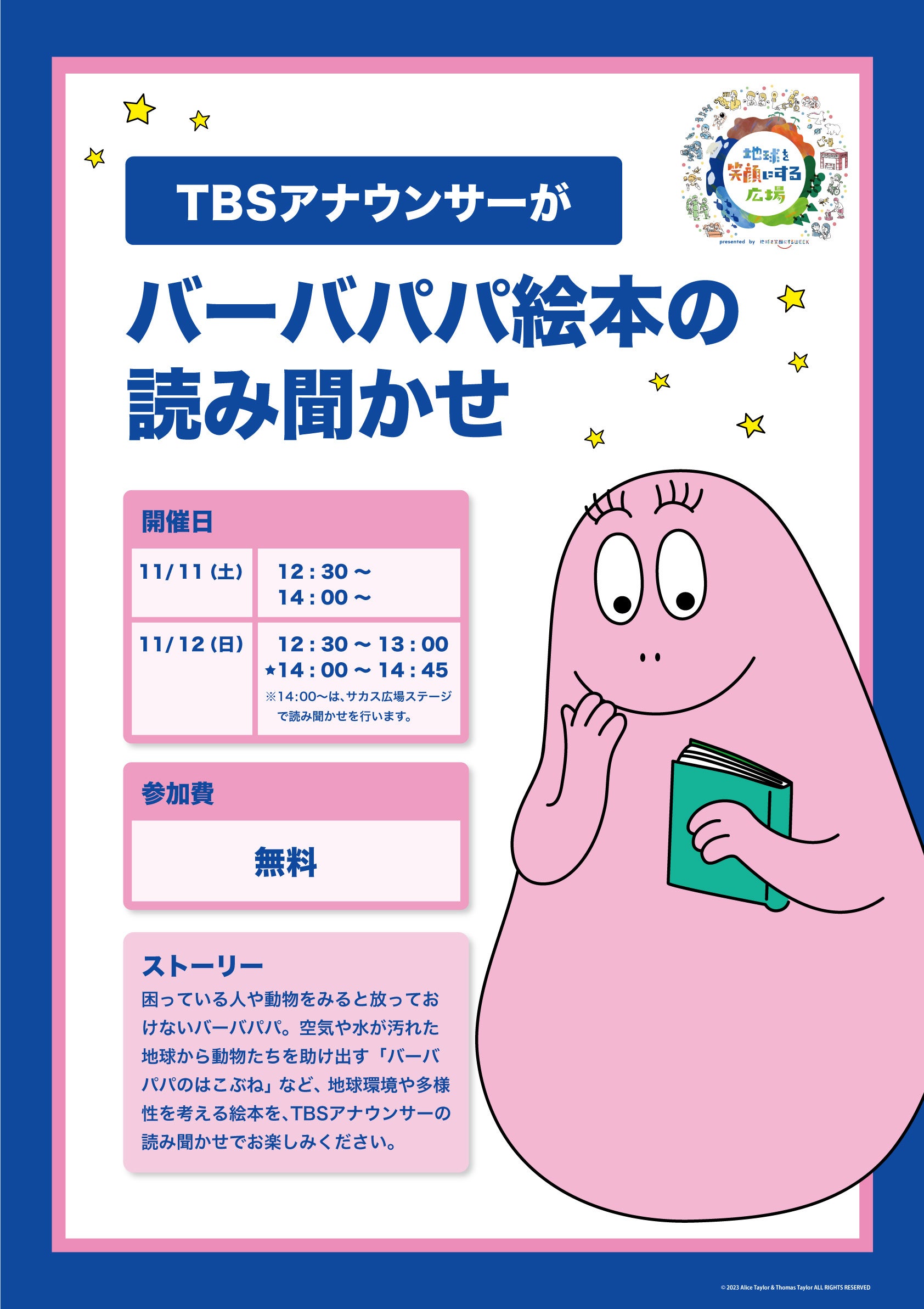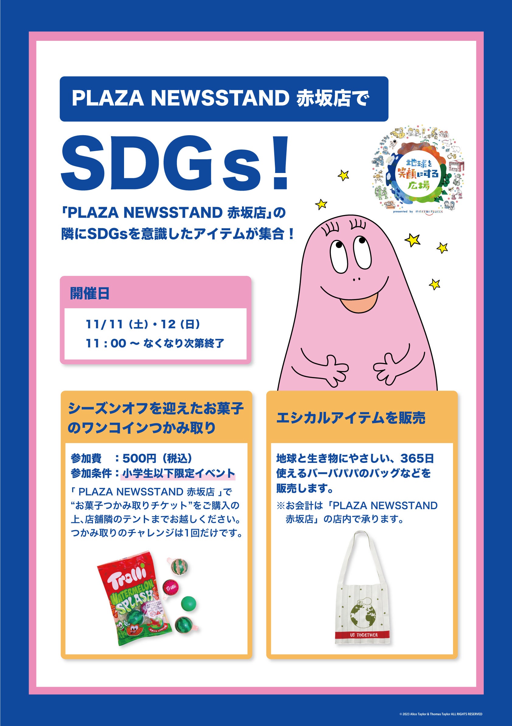 その他、「地球を笑顔にする広場」開催期間の後半にあたる11月11日(土)・12日(日)には、PLAZA NEWSSTAND 赤坂店付近の特設テントにて、「シーズンオフを迎えたお菓子のつかみ取り」、「TBSアナウンサーによる『バーバパパ』の絵本読み聞かせ」イベントをおこないます。