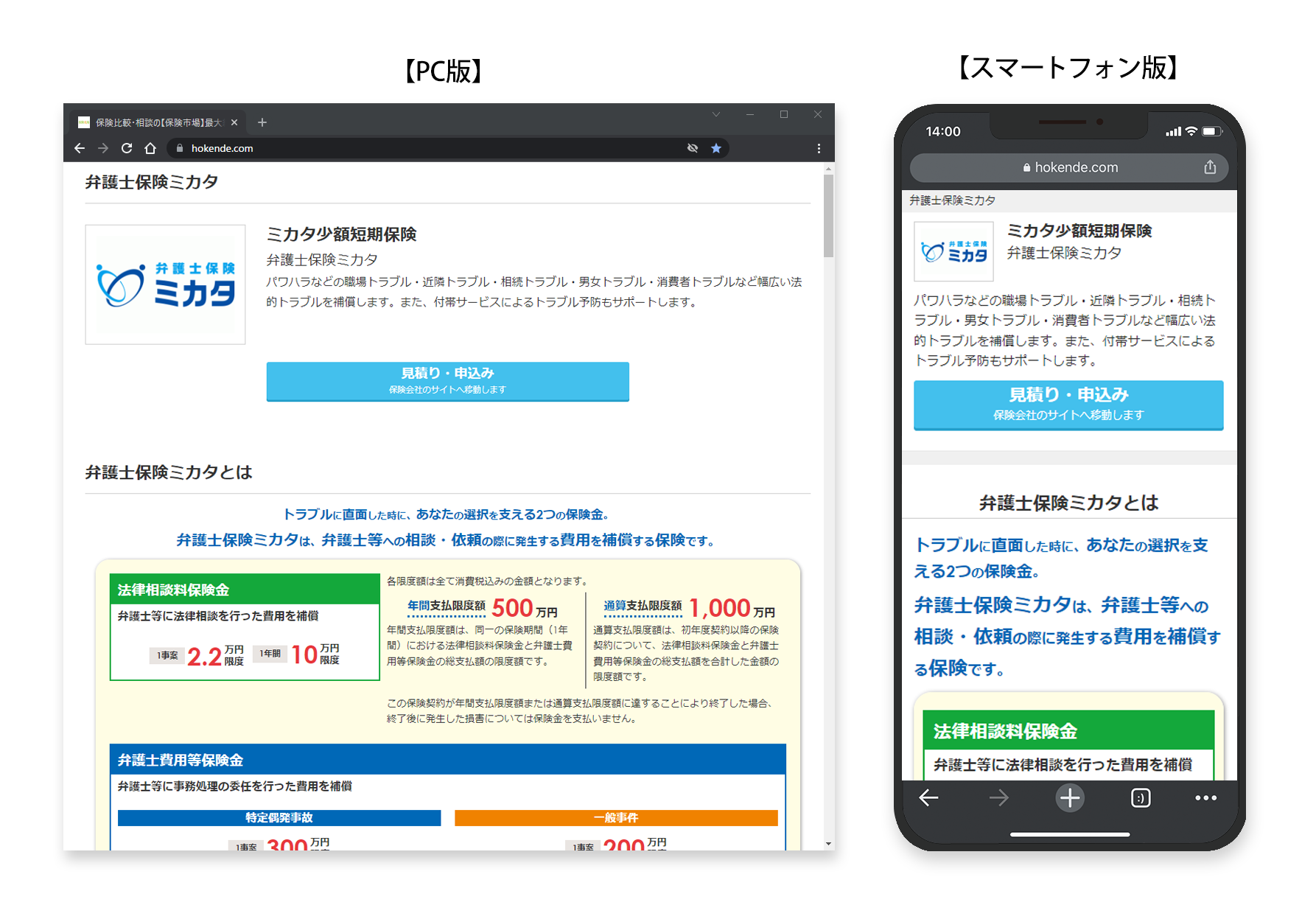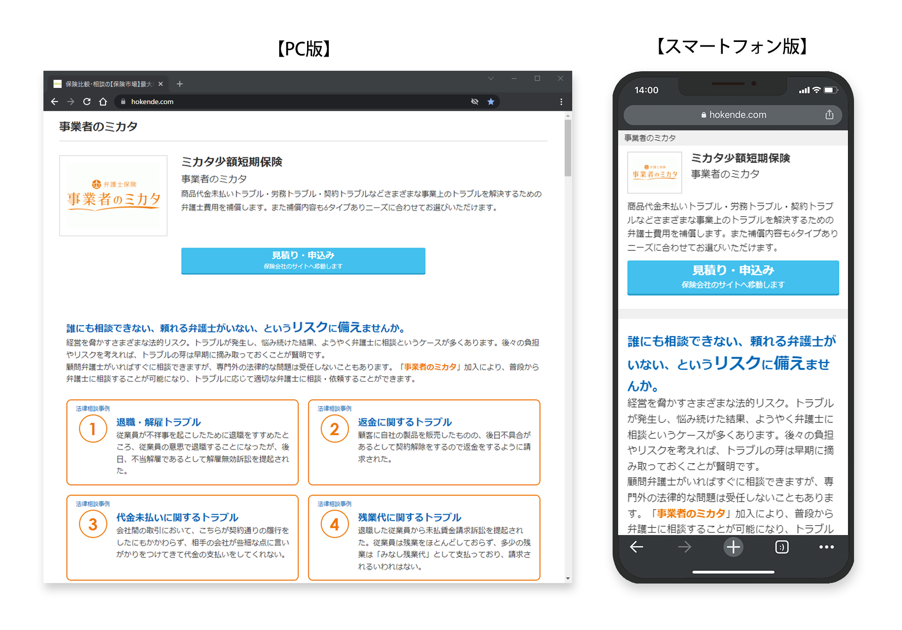保険選びサイト「保険市場」に掲載を開始したミカタ少額短期保険の『弁護士保険ミカタ』『事業者のミカタ』は、通信販売・インターネットでお申し込みいただける保険商品です。「保険市場」PCサイトおよびスマートフォンサイトにて、商品の詳細をご確認いただけます。