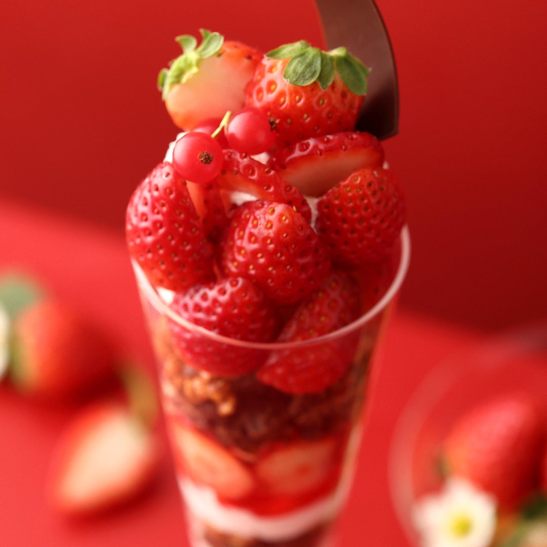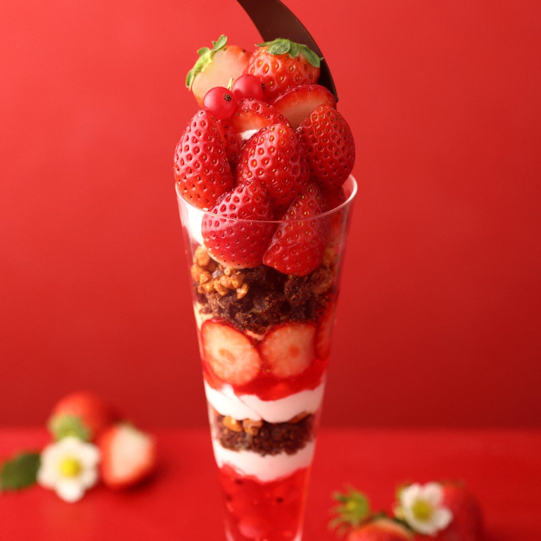 フェアの中心となる「苺のパフェ」は、甘酸っぱい苺にあわせるクリームを、今回から“フランボワーズ・マスカルポーネクリーム”に変更し主役の苺がより引き立つ味わいにリニューアルしました。またトップに飾る真っ赤な苺を、今にもグラスからこぼれ落ちそうなイメージのデコレーションに変更し、より苺感がアップした華やかな見た目に。