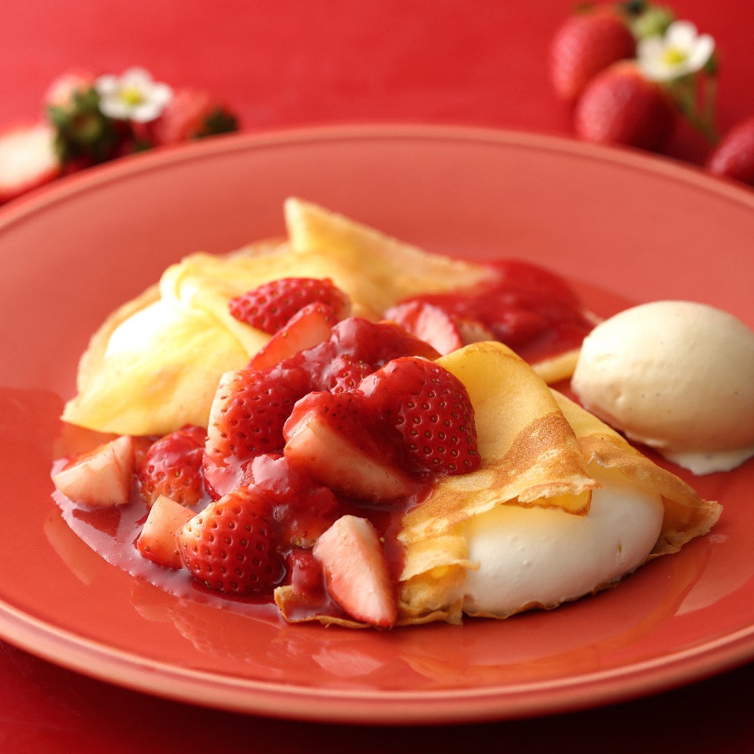 焦がしバターを加えてこんがりと焼いた自家製クレープに、程よい甘さのクレーム・シャンティを包みました。たっぷりの苺とバニラアイスを添えて。