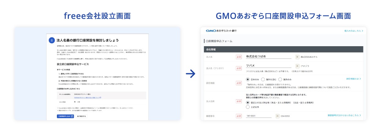 freee株式会社(本社:東京都品川区、CEO:佐々木大輔、以下freee)とGMOあおぞらネット銀行株式会社(本社:東京都渋谷区、代表取締役会長:金子岳人、代表取締役社長:山根武、以下GMOあおぞらネット銀行)は、freeeが提供する「freee会社設立」サービスにおいて、法人登記の完了を待たずに、会社設立の準備段階で、GMOあおぞらネット銀行の法人口座開設申込が行える機能の提供を4月6日から開始します。