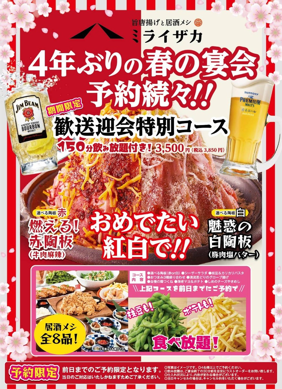 そこで「ミライザカ」では、4年ぶりとなる今回のマスク着用緩和の方針を契機に、感謝を伝える別れや新しい出会いを祝した「歓送迎会」という文化を通じて、お客様に美味しいお酒とお食事で大切な思い出をつくっていただきたいという想いから、今回のコース導入を決定しました。