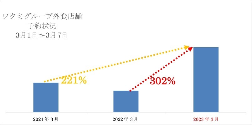 2023年3月1日から3月7日までに受け付けた3月中の予約件数は、2021年対比で221%、2022年対比で302%と大幅に伸長しています。コロナの影響もあり予約をしにくい状況であった21年・22年に対し、23年はマスク規制の緩和により歓送迎会の準備をしているお客様が多い傾向が見られます。