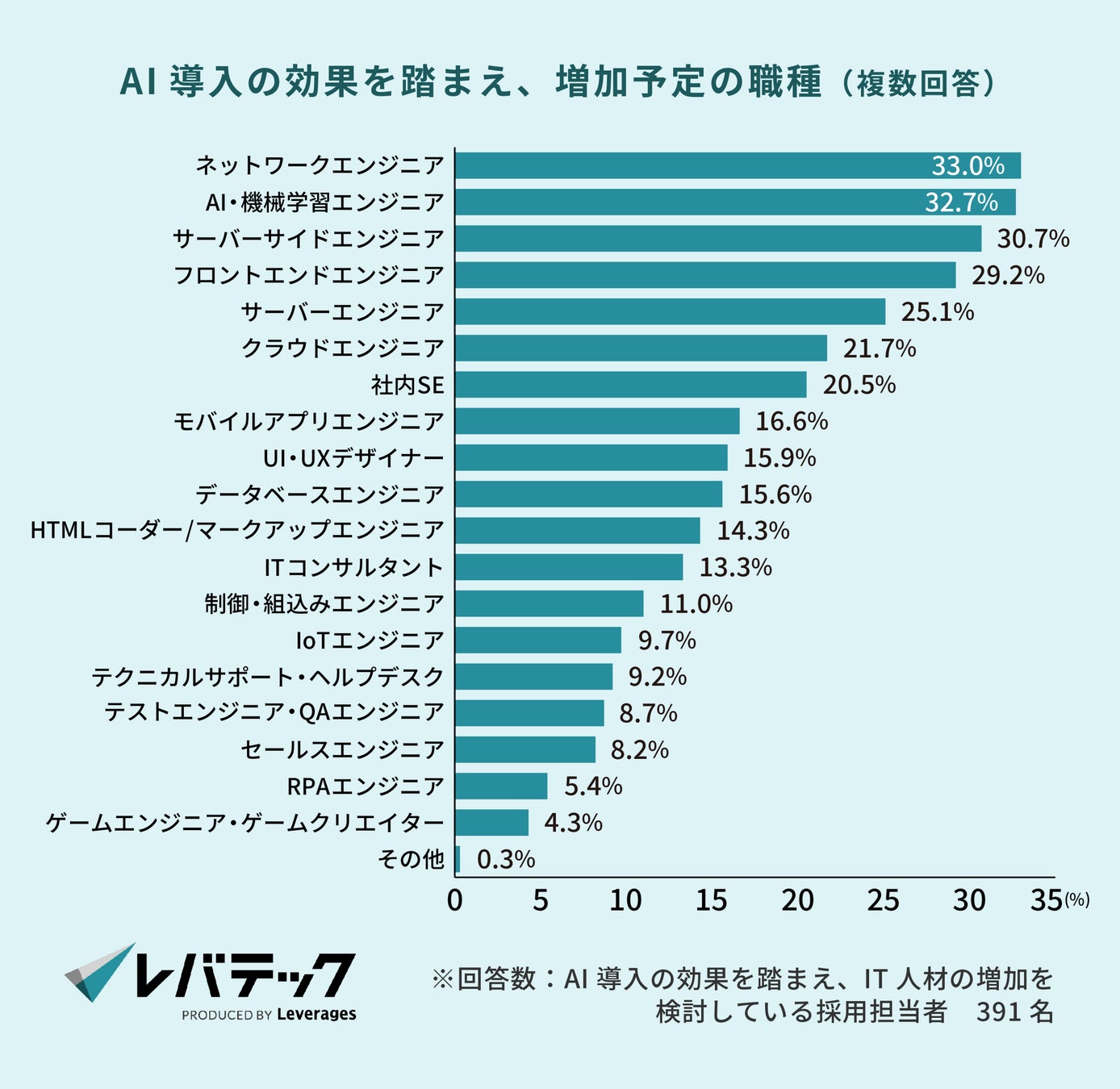増員予定と回答した企業に、今後増やしたい職種を尋ねたところ、「ネットワークエンジニア」「AI・機械学習エンジニア」が上位に挙がりました。AI活用が進む中で、AI技術そのものを担う人材に加え、安定したシステム運用やセキュリティを支えるインフラ領域のIT人材に対する需要が高まっている状況がうかがえます。