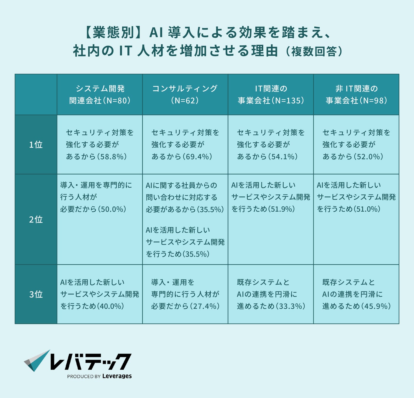IT人材を増員する理由として最も多かったのは、「セキュリティ対策を強化する必要があるから(55.8%)」でした。次いで「AIを活用した新しいサービスやシステム開発を行うため(46.8%)」「導入・運用を専門的に行う人材が必要だから(37.3%)」と続きます。