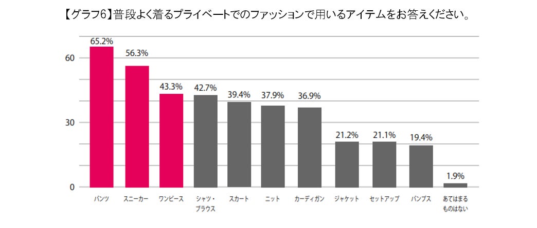また、同じようにプライベートファッションについて尋ねたところ、第1位が「パンツ」(65.2%)、第2位が「スニーカー」(56.3%)となり(グラフ6)、公私ともに動きやすさ・軽快さを重視している傾向にあり、アクティブであることがわかります。