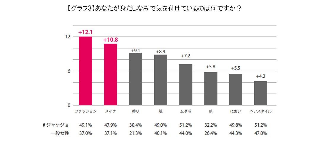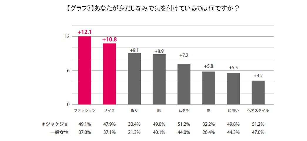 「あなたが身だしなみで気を付けていることは何ですか」という質問に対し、#ジャケジョの49.1%が「ファッション」と回答。一般女性の37.0%に対し12.1ポイント高いことがわかります。「メイク」の項目においても10.8ポイントと差が開く結果となりました(グラフ3)。